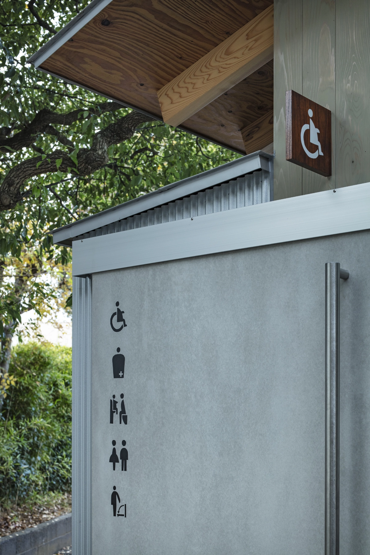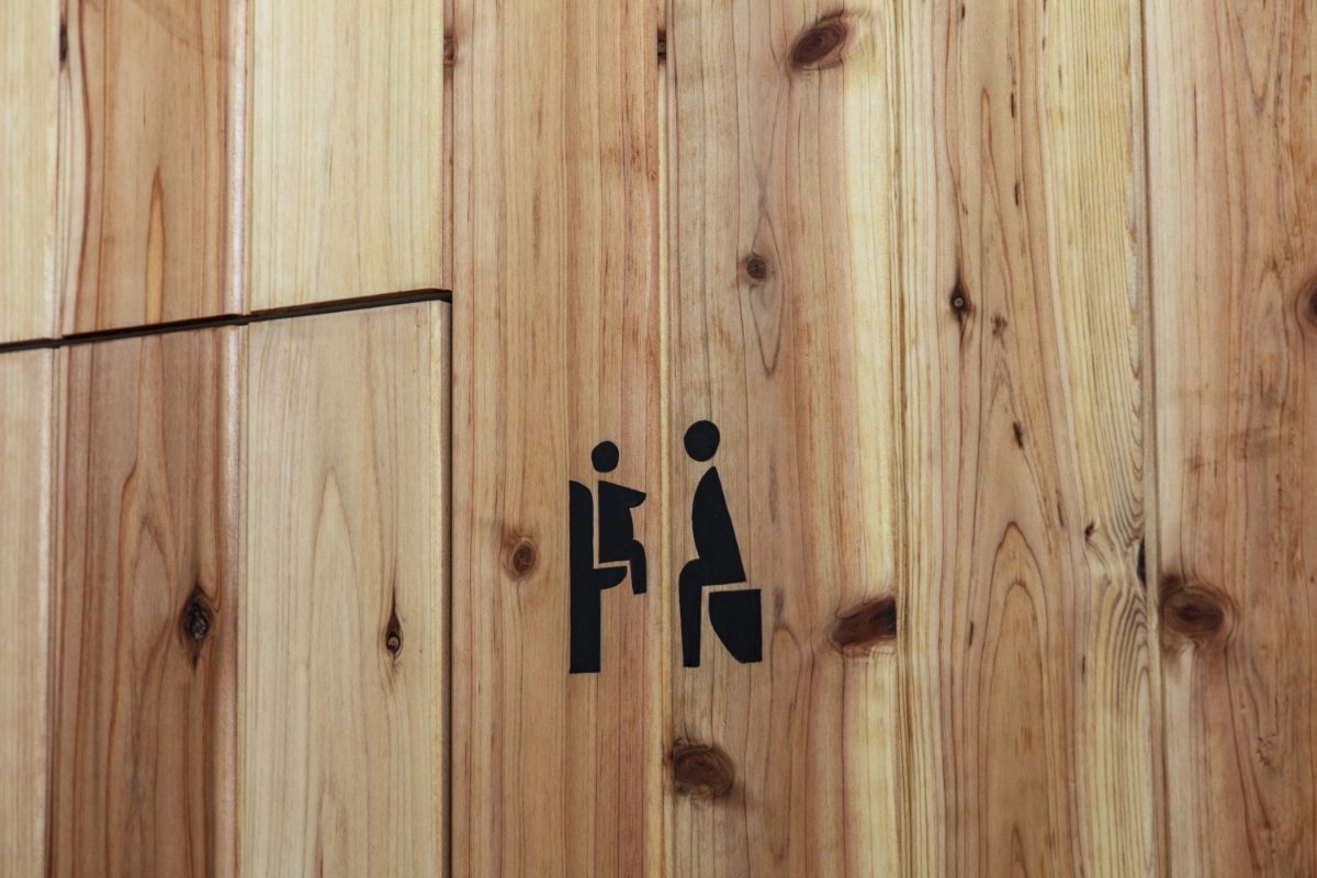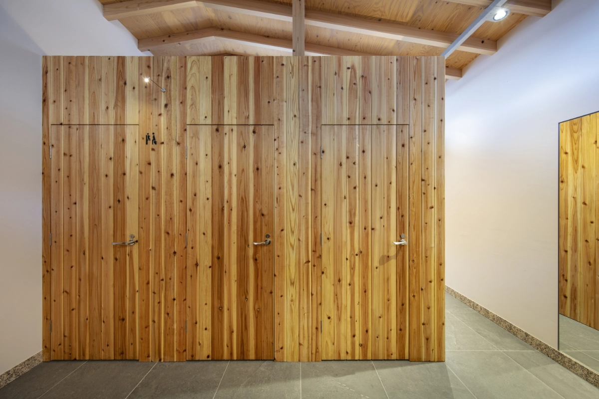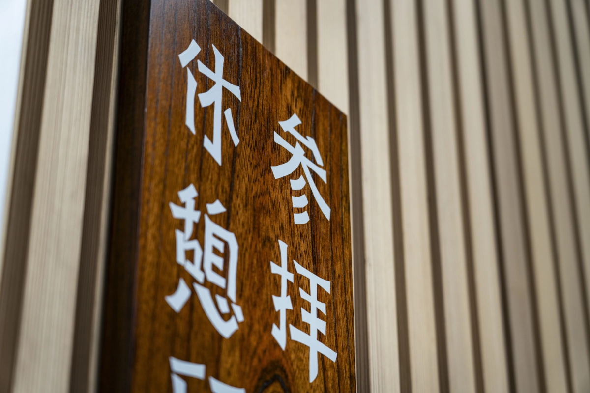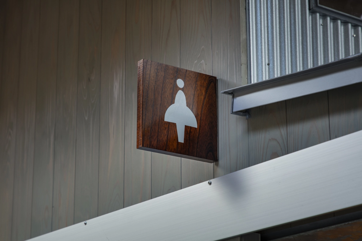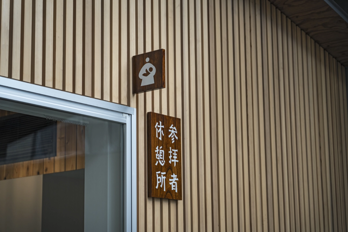 For the implementation of the signs, I first researched the existing signage used along the approach to the shrine and within the precincts. I learned that some of the trees growing along the approach had been felled and preserved by the shrine as timber, and decided to use this material for the signs. There were also wooden signboards within the precincts with their histories handwritten in black lacquer. Referencing these, I applied wipe-on lacquer to the shrine timber and painted pictograms over it by hand with a brush. This method was then extended to the walls and doors inside the facility, where the signage was also rendered by hand.