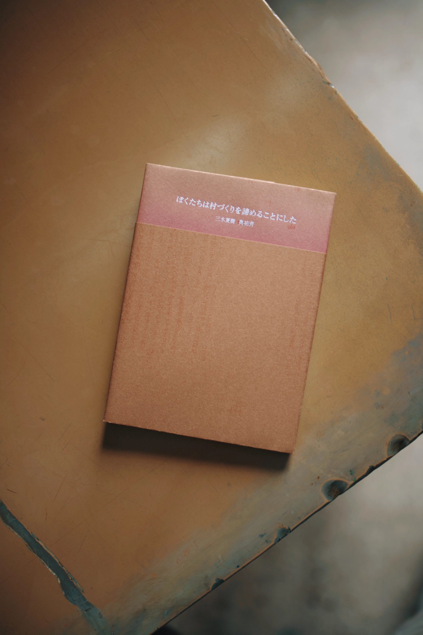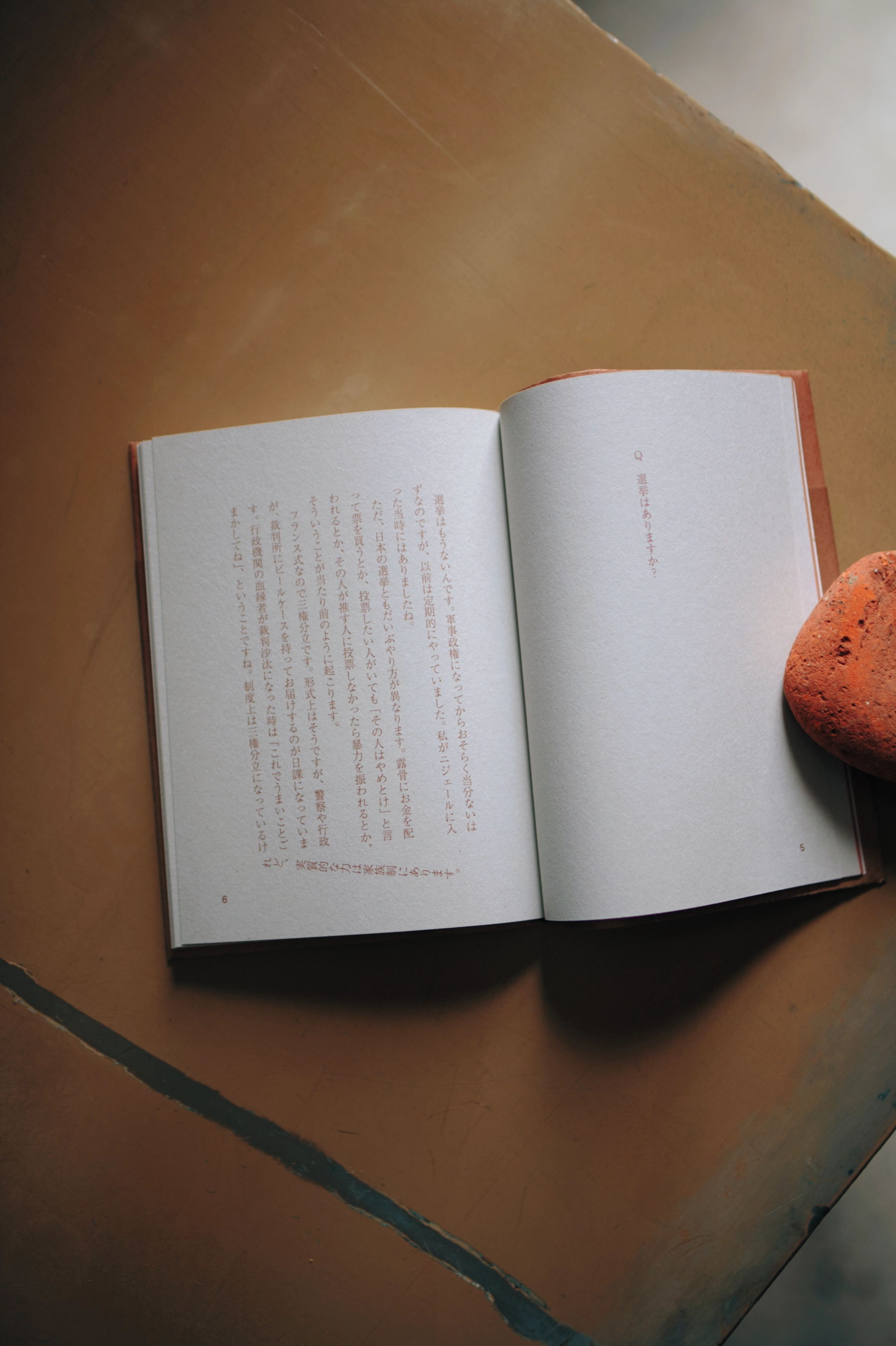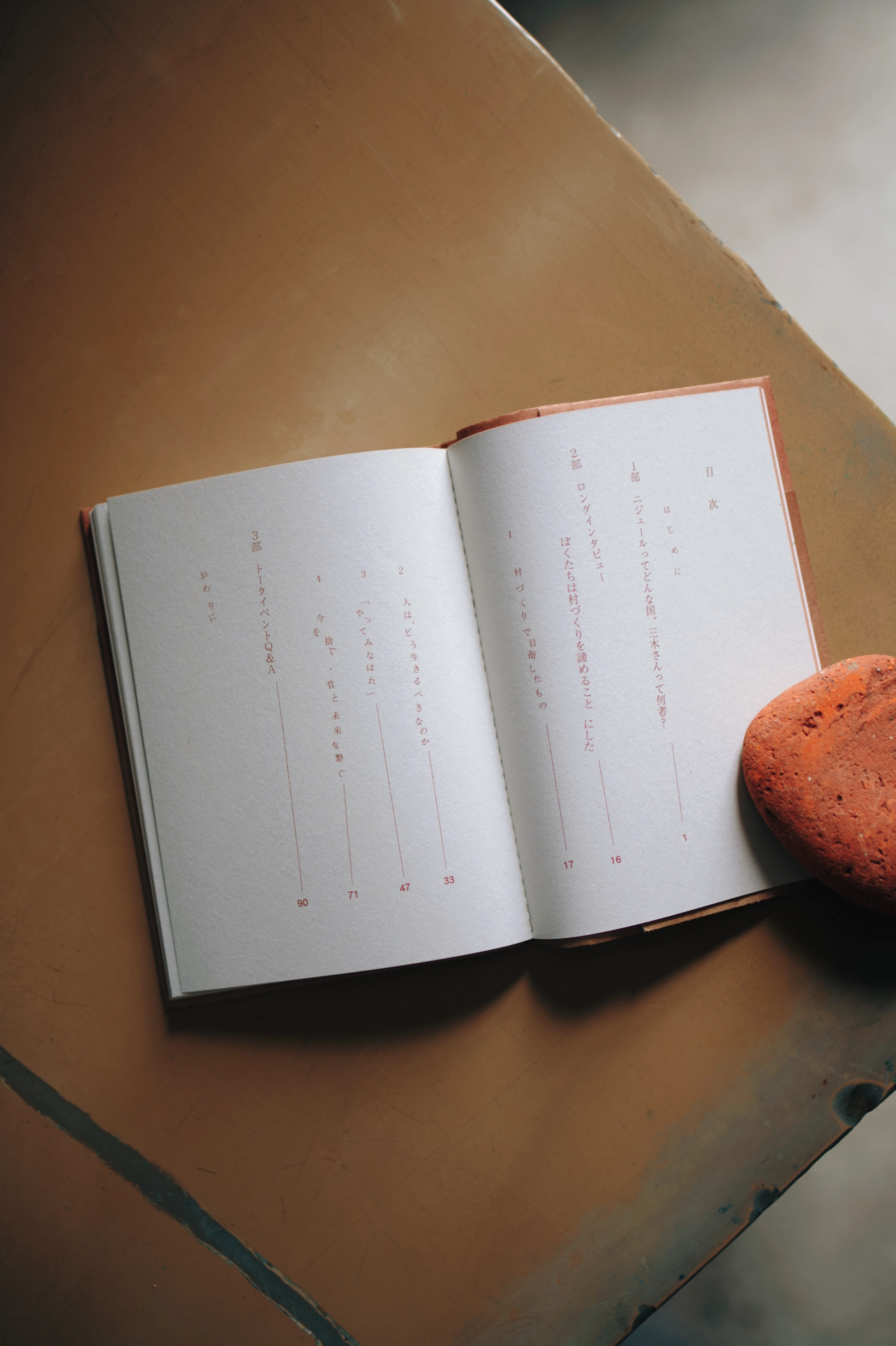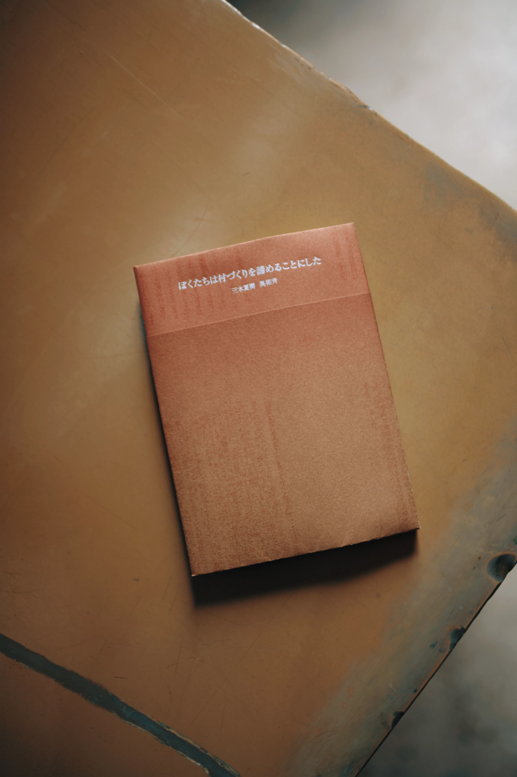サハラ砂漠南縁に位置する西アフリカの国、ニジェール。著者の二人はこの国で小さな村を作ろうとしていた。日本でのクラウドファインディング、土地の購入、井戸掘り、そして政治や血縁などといったさまざまな問題で村づくりが立ち行かなくなっていくルポルタージュを束ねた本である。装丁を考える際には、現地の写真が収録されないこと、綺麗な本は望まれていないことを踏まえ、本文と同じ紙を折り表紙に仕立てた。チリをつけ上製本の体はなしているが簡素で弱い本を目指した。ほかにも現地の土をインクで再現する試みやプリントアウトした文字を切り貼りして制作した紙元版で入稿を行うなど、制作の痕跡が残る作り方を採用している。