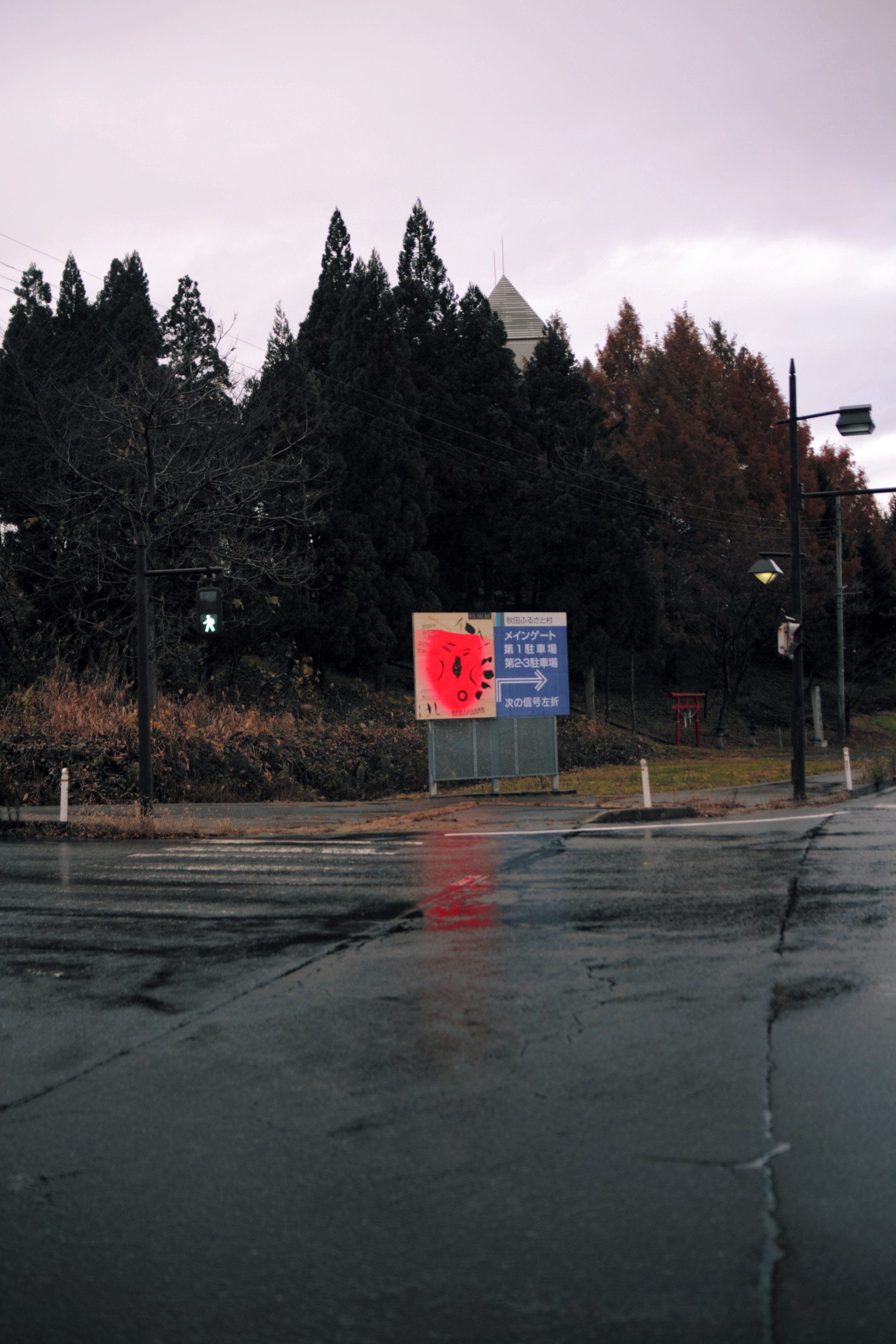 It was a large sign, but since only two were needed, we borrowed a corner of the backyard at the Akita Museum of Modern Art, the exhibition venue, and improvised everything—from the support structure to the printing. Carpenters Mr. Tatsuhiro Ara and textile designer Ms. Yō Ōe joined me. We went to a nearby home center to get wood, outdoor paint, and spray cans. First, they built the support. On top of that, I used spray paint to set the position of the face. Once that was in place, the overall layout became visible, and I printed the exhibition information with silkscreen.