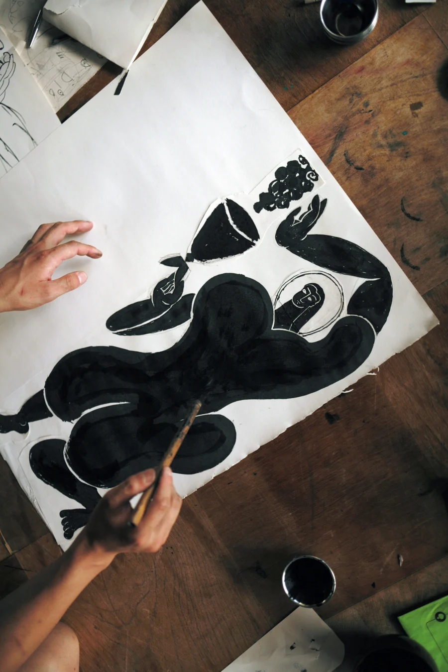 Since both grapes and wine have a sense of freshness and vitality, I decided to use materials that could express that same quality—wet media. I gathered brushes, India ink, a fountain pen, some ink, and paper.