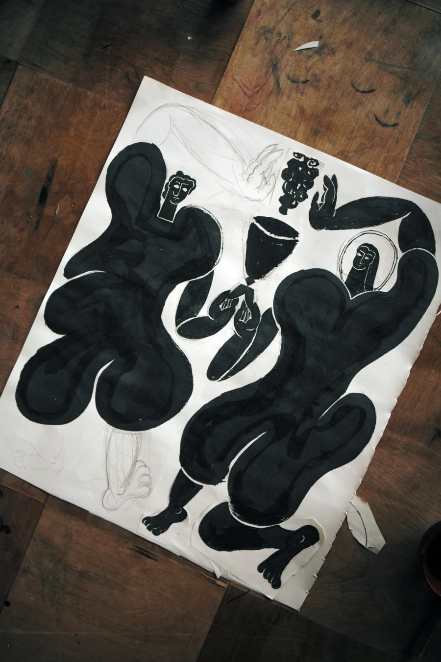 葡萄もワインもみずみずしいので、濡れる画材で描くことにした。筆と墨汁、万年筆とインク、それから紙を用意する。