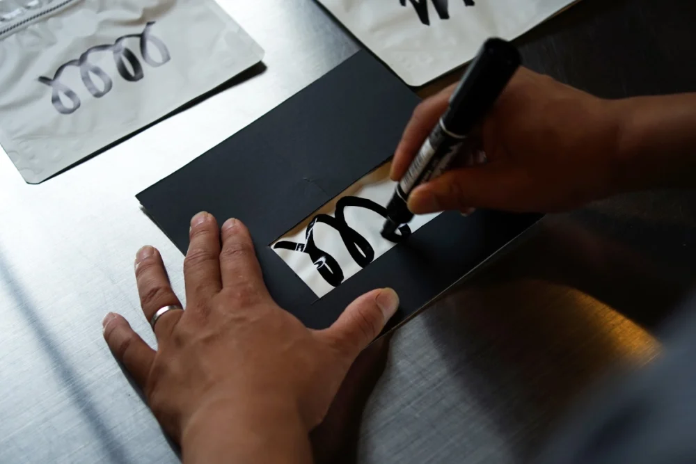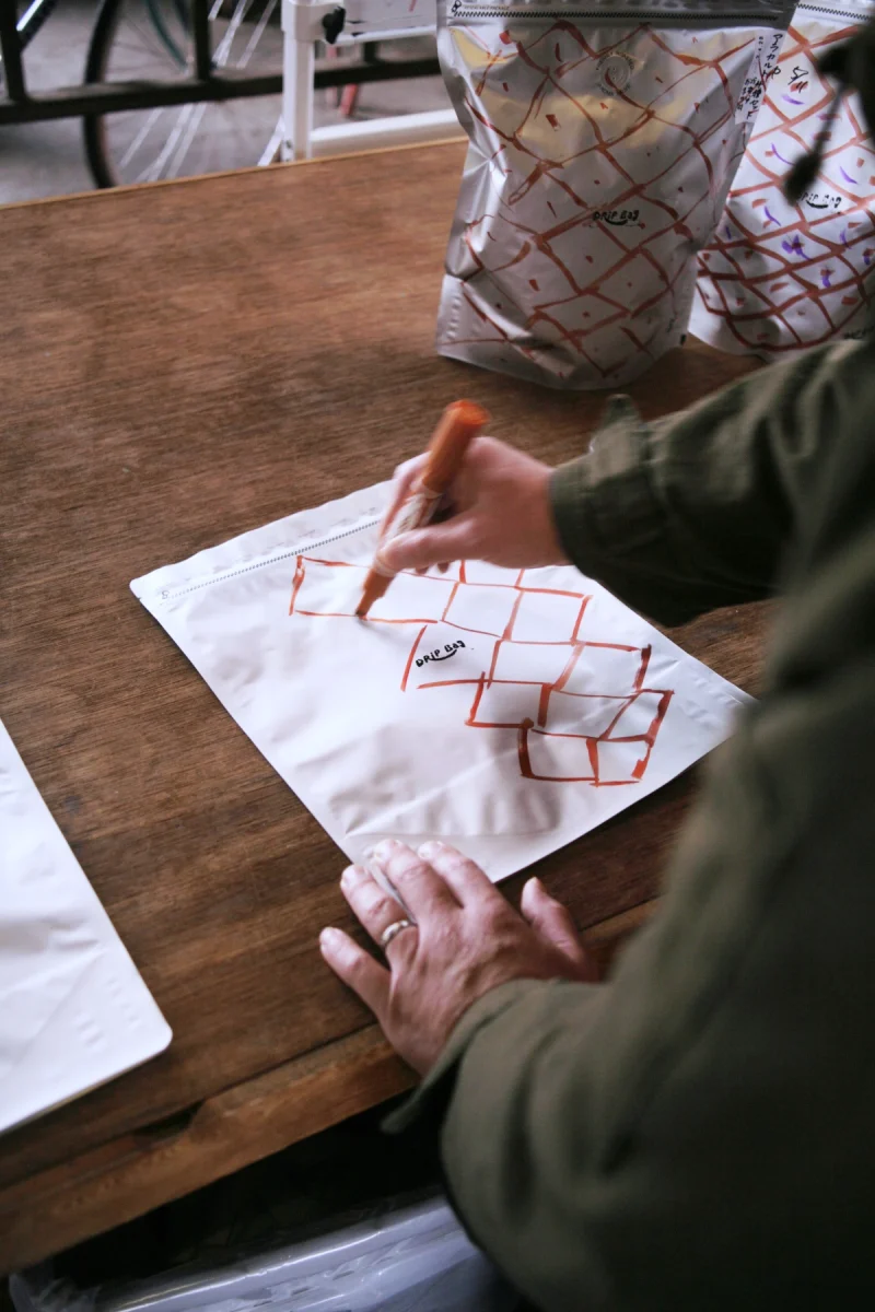 一つは直書き方式。白い袋と同寸の厚紙に窓を空けた治具を用意し、黒の油性マーカーで描く範囲を限定する。筆記用具となるマーカーはポップを描くのによく使っているものから選んだ。モチーフは、渦、湧き、余韻、果実の輪郭――風味の比喩としての一筆書き。1〜2時間の短いワークショップで描き方を共有すれば、その日から誰でも実装できる。もう一つは、家庭用プリンタで出力する汎用ラベルに、色だけで風味差を描き分ける方法。どちらも「工程を減らす」のではなく、「工程を現場へ移す」設計で、意思決定から陳列まで工程が店舗におさまることとなった。