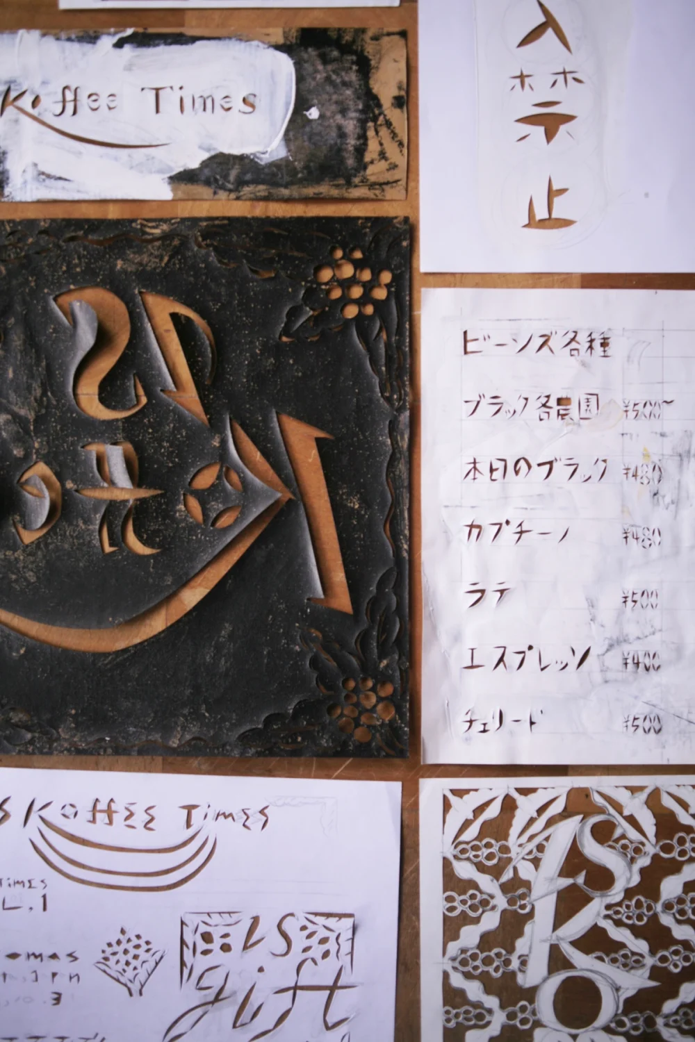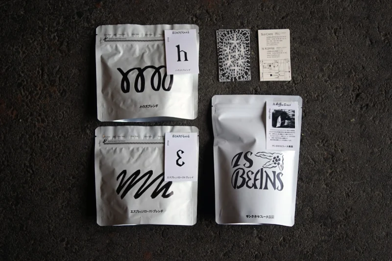 The work of a roastery is a long chain. Travel to equatorial origins, cup at dozens of farms, buy lots we trust. Back in Japan, begin the patient repetitions of roast profiling, finding by hand the point that opens the bean without breaking its character. Packaging is an outfit for carrying, shelving, choosing—and also, it ought to carry the trace of that long chain. With that in mind I brought stencil dyeing, learned at my family’s textile studio, into graphic work. Carve persimmon-tanned paper; press out paste and dye with a spatula. In printing terms it is plate-making, but in practice the touch of the block and small deviations remain on the surface. At the same time I proposed not making a symbol mark or typeface early. Services and products shift with season and society. Rather than giving a crest to a body still in motion, let repetition and accumulation of artifacts condense into an image by themselves; a visual identity that grows, not is imposed. That seemed the healthier path.