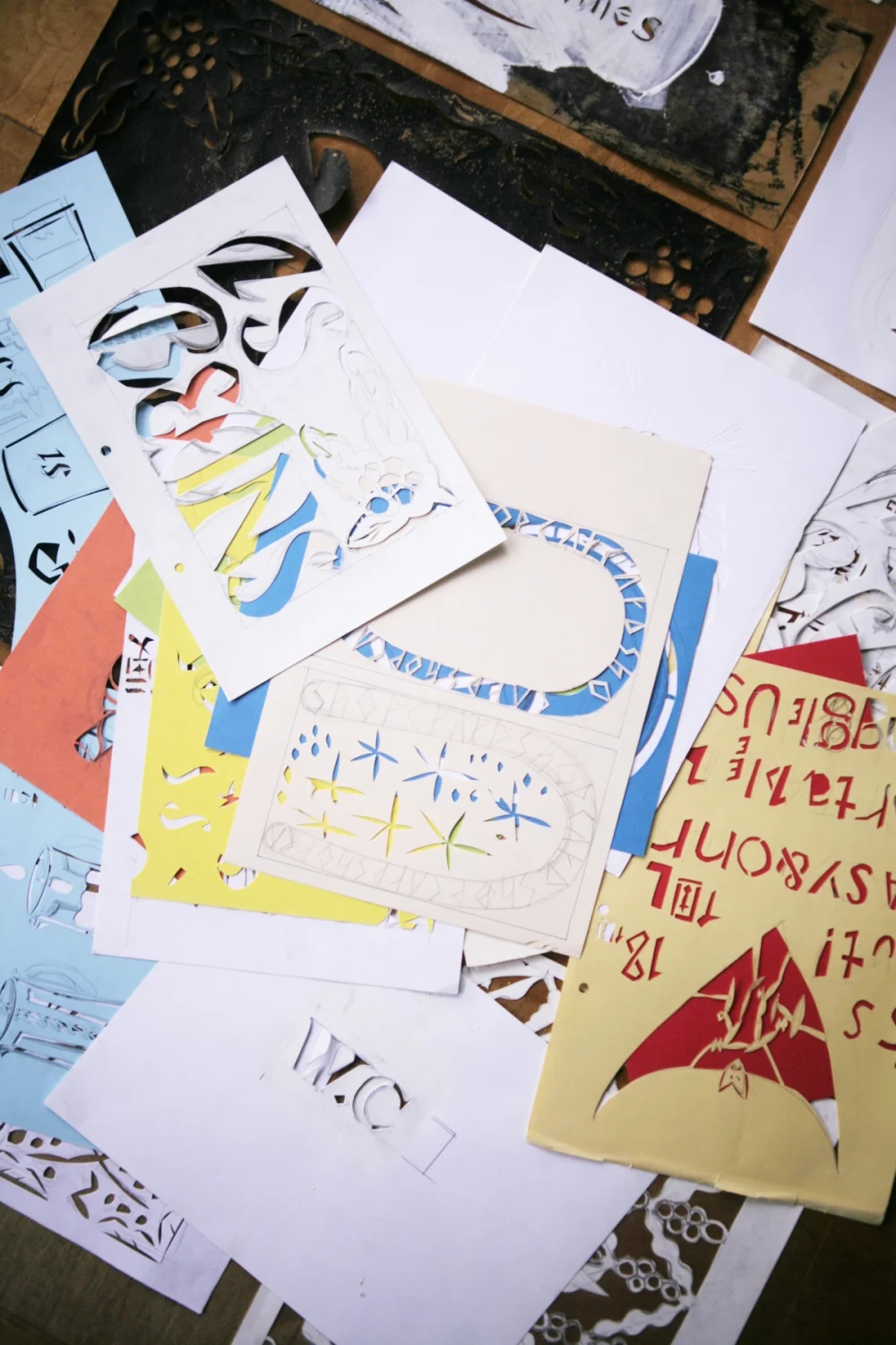 店のサインや看板は、外注せず自分たちで作ると決めた。紙で版を切り、壁や扉に直接刷る。道路に面した木壁は、私のスケッチをもとに全員で彫り、看板へと変えていった。内製の楽しさは伝播する。私が切り紙で作った文字や図案は、やがてスタッフの手描きポップに複製され、店内の視覚言語は「似ているけれど同じではない」表情を帯びはじめた。紙媒体は当初、手彫りの版で刷ったが、原版が増えるにつれ、既存の切り紙を素材にデータ上で再編集し、ポイントカードや包装紙へ展開する流れが整った。