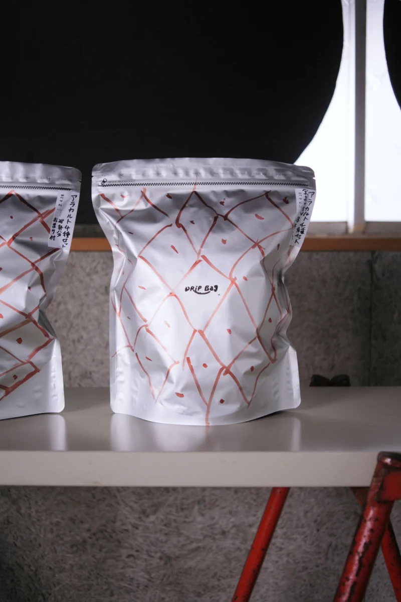 ローステリアの仕事は長い連鎖を成す。赤道直下の産地へ赴き、数十の農園でカッピングを重ね、納得のいくロットを買い付ける。日本に戻れば、焙煎の温度域を探る地道な反復が始まり、豆の性格を崩さずにひらくポイントを手仕事で掴んでいく。パッケージは、運ぶ・並べる・選ばれるための装いであると同時に、この長い連鎖の気配を残す媒体でもあるべきだ――そう考え、私は実家の染織工房で身につけた「型染め」をグラフィックに持ち込んだ。渋紙を彫り、糊や染料をヘラで押し出す。印刷でいえば製版に当たるが、実際には版の手触りや小さな逸脱がそのまま画面に残る。同時に、早い段階でシンボルマークやタイプフェイスを作らないことを提案した。サービスや商品は季節や社会の要請とともに変わる。変わり続ける運動体に紋章だけを先に与えるのではなく、制作物の反復と蓄積が自ずと「像」を結び、結果としてビジュアル・アイデンティティが自生する方が健全だと判断したからだ。