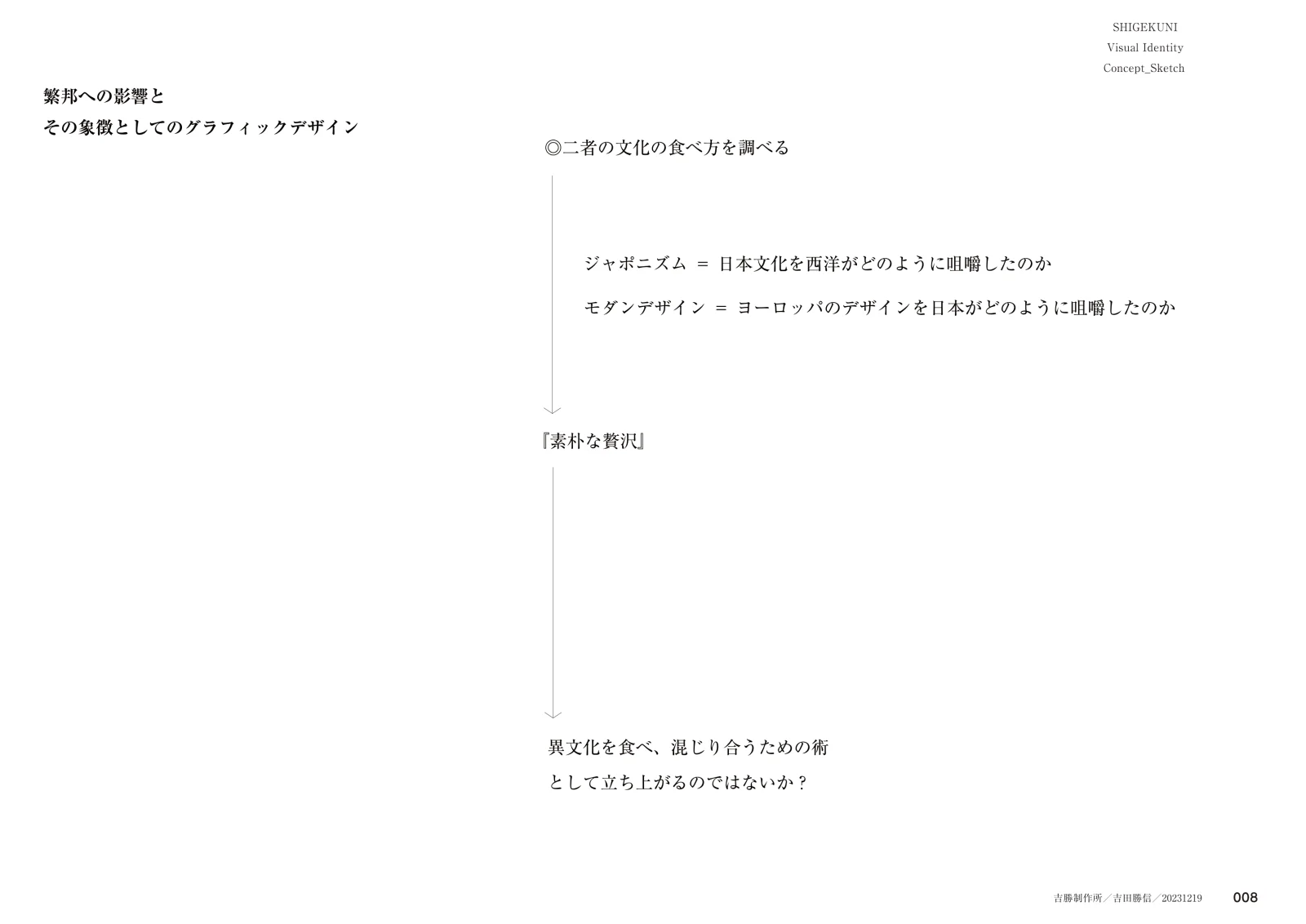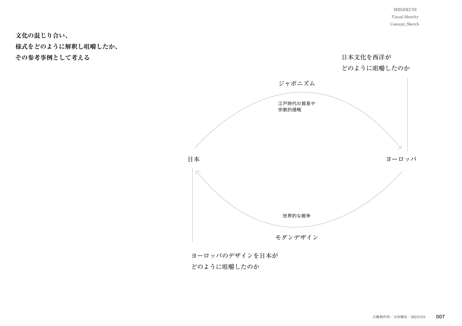今回はこの「文化のローカライズ」を一つの視点とした。「素朴な贅沢」という異なる二つの言葉が合成されたように昭和初期が挟まれた二つの様式を参照した。西洋が日本文化をどのように咀嚼したのか、また日本がヨーロッパのデザインをどのように取り入れたのかが重要な視点とされる。江戸時代の貿易や宗教的侵略を背景にジャポニスムが広まり、世界的な戦争を経てモダンデザインへと展開し、日本は再びヨーロッパのデザインを咀嚼し直していった。この往復的な関係は、文化解釈と翻訳の具体例とみなすことができる。その二つを再合成し、現代へ継承してゆくときグラフィックデザインが立ち上がるのではないかと考えた。